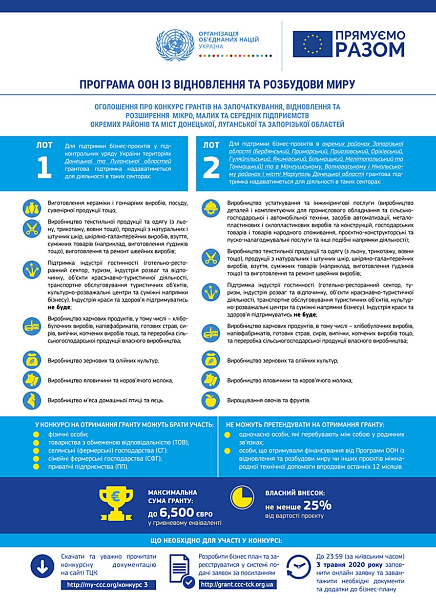 Програма ООН із відновлення та розбудови миру за підтримки Європейського Союзу оголошує конкурс малих бізнес-грантів на започаткування, відновлення чи розширення мікро, малих та середніх підприємств на підконтрольних уряду України територіях Луганської та Донецької областей, та в окремих районах та містах Запорізької області уздовж узбережжя Азовського моря. З метою системного та сталого розвитку пріоритетних секторів економіки цільових регіонів, грантова підтримка надаватиметься для реалізації бізнес-проєктів: