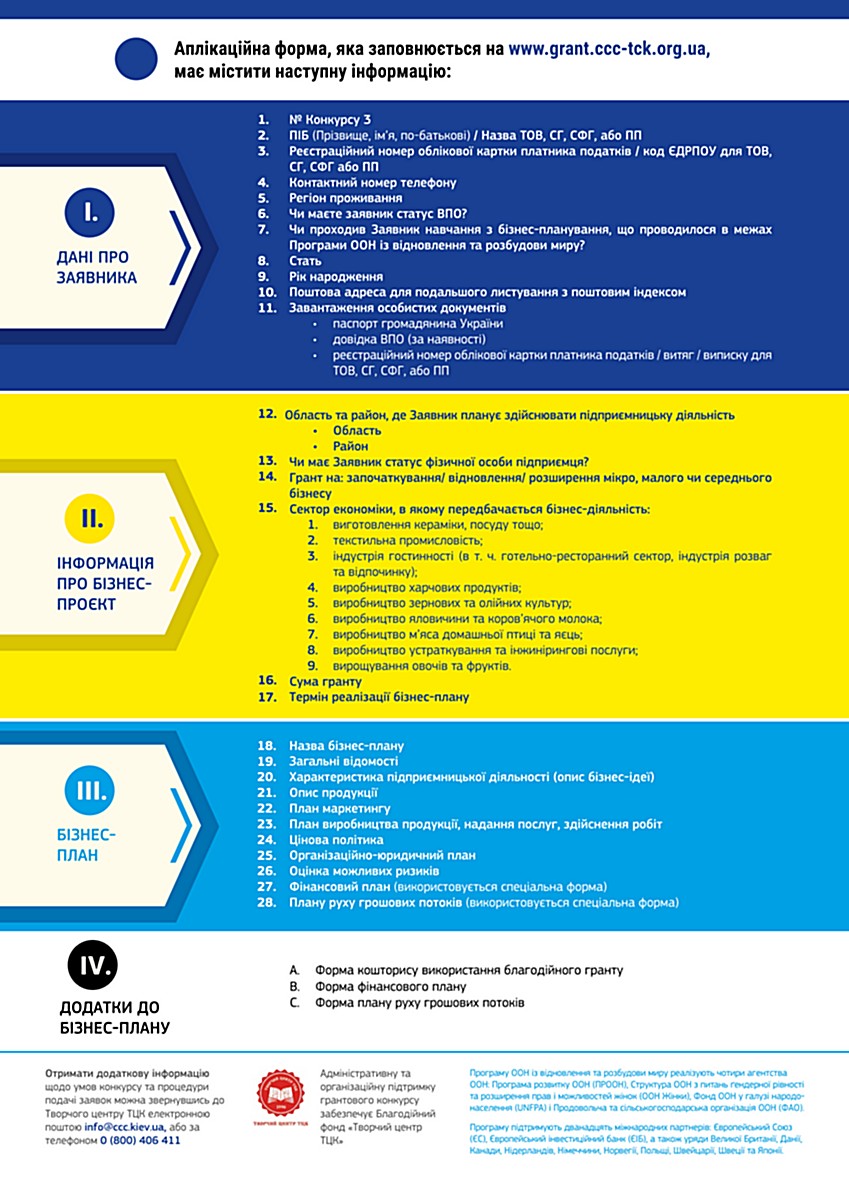 Детальна інформація про конкурс та його вимоги, рекомендації з підготовки бізнес-планів та інструкція з подачі онлайн заявки розміщені в Посібнику з підготовки та подання заявок на участь у конкурсі на сайті ТЦК ccc-tck.org.ua, на окремому сайті грантової програми http://my-ccc.org/ та на сторінці програми в соціальній мережі Facebook facebook.com/ccc.creative.centre.