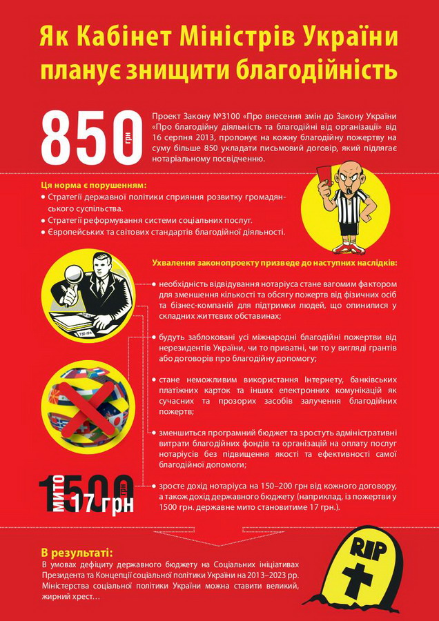 Ми, представники громадянського суспільства України глибоко стурбовані вимогою законопроекту Кабінету Міністрів України № 3100 про обов’язкове нотаріальне посвідчення договорів про благодійну пожертву коштів на суму від 850 грн. та закликаємо не включати цей законопроект до Порядку денного ВР.