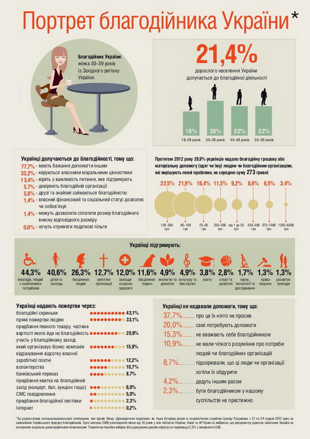 Відповідно до офіційної статистичної інформації, у 2012 році задекларовані суми благодійних внесків становили 3,4 млрд. грн. для благодійних організацій і 1,6 млрд. грн. для громадських організацій, не кажучи про релігійні організації та прямі приватні пожертви на лікування та інші соціальні послуги для громадян (особливо в сфері онкології, серцевої хірургії та ДЦП), підтримку діяльності митців, освіту студентів, впровадження інноваційних моделей соціальної роботи тощо. Цією діяльністю громадяни України, благодійні фонди і організації, бізнес-компанії допомагають громадянам і державі вирішувати гострі соціальні проблеми, які держава сьогодні не в змозі вирішити самостійно.